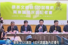 2016-04-14 12:35:45兩岸政策民調公布蔡英文520演說相關民調,六成民眾認為蔡英文應該著重內政議題,而非兩岸議題,5成9民眾認為蔡英文不應該在演說中提到兩岸同屬一中。近5成民眾認為兩岸減緩交流,北京當局應負起更大責任,學者則是認為,民眾預料中共520之後,將對新政府有更多打壓行為。