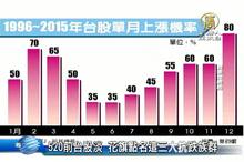 2016-04-25 07:02:44早安新唐人先帶您關心,520總統就職日,倒數不到一個月,過去四次520就職前,台股盤勢都偏弱, 花旗環球證券台灣區研究部主管谷月涵 指出,考量到中國因素與「總統週期」,他對台股短期內走勢看法轉趨保守;不過,也點名了三大抗跌族群,包括生技、金融、半導體等等。他認為,台灣生技股長線仍然看好,也有可能出現意想不到的金融改革措施。