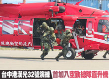2016-08-23 20:53:32一連五天的漢光演習,今天下午在台中港2號碼頭舉行反登陸操演,除了出動眼鏡蛇直升機,雲豹甲車外,首度將空勤總隊 黑鷹直升機納入,跨部會聯合作戰,提升國軍的戰力。
