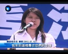 2012-07-12 21:03:39新聞頭條,持續帶您關注,台灣新竹科技公司經理、法輪功學員鍾鼎邦,被中共綁架已經第25天,面對台灣政府營救行動始終消極,鍾鼎邦的女兒,鍾愛,在11號晚間,與小姑姑搭機前往美國華府,希望尋求國際奧援,來營救父親。台灣法輪功律師團發言人朱婉琪也表示,希望在國際社會以最大分貝,呼喚國際正義,儘速營救鍾鼎邦回台。