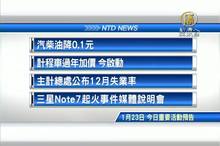 2017-01-23 07:32:31接著看到,今天, 1月23 日,星期一 ,有哪些重要活動。首先是,民生消息,汽柴油今天降0.1元。再來是,計程車過年加價, 今天多個縣市啟動,財經消息,主計總處公布12月失業率。最後是,三星今天舉辦Note7起火事件媒體說明會。
