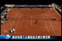 2014-06-08 21:01:13來看到法網女雙決賽的最新消息,台灣女子網球一姐謝淑薇與中國女網好手彭帥,以6比4,6比1,擊敗義大利組合薩拉‧埃拉尼以及羅貝塔‧文琪,拿下冠軍。我們先來看比賽的精彩畫面。