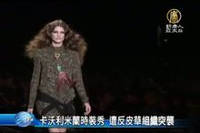 2013-02-22 21:36:05作為全球四大時裝週之一的2013年秋冬米蘭時裝週正在熱烈的進行中,但在星期四(22號)義大利時裝設計師羅伯特‧卡沃利的時裝秀上卻遭遇了不速之客,一名反皮草組織的成員登上T臺大聲呼喊抗議。