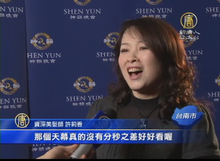 2015-03-13 07:21:31神韻紐約藝術團在高雄的壓軸演出,已經圓滿結束,儘管當天不是假日,卻是票房滿座,也締造連八場售票百分百的紀錄。電台知名主持人,在現場向記者表示,神韻演出中,善能量的傳遞,最令她佩服與感動。