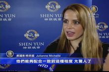 2015-01-11 21:08:08美國神韻紐約藝術團10號晚間在林肯中心的第三場演出再次爆滿。美國影視明星,參加演出《華爾街:金錢萬歲》、《超凡賽者》等影片的朱莉安妮‧蜜雪兒讚歎,神韻是視覺饗宴,演員完美無暇,來聽聽她的感受。