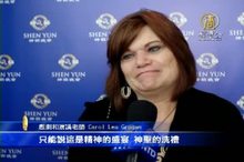 2015-01-12 22:54:30卡羅爾‧格羅根 在學校裡教授戲劇和公開演講課,1月10日下午,她觀看美國神韻巡迴藝術團在達拉斯的第二場演出時多次感動落淚,形容這是精神的盛宴,神聖的洗禮。