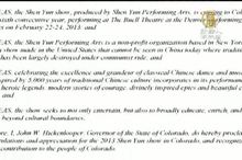 2013-02-23 21:28:57享譽全球的神韻國際藝術團本週末蒞臨美國科羅拉多州丹佛市,科羅拉多州郡市政要紛紛發來褒獎和賀信,盛讚神韻藝術團為恢復中華傳統文化所做出的貢獻,感謝神韻藝術團為他們帶來神傳文化的精髓。