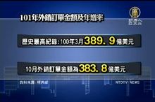 2012-11-20 21:26:35經濟部公佈今年10月分外銷訂單統計,10月份外銷訂單總金額,為383.8億美元,較去年增加11.7億美元,增加3.2%,9月10月 外銷訂單較去年同月比 持續呈現正成長,官員表示,如果11月、12月的訂單金額都達到376億美元以上的話,今年外銷訂單總額有機會可以轉正。