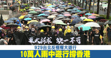 2019-09-29 23:09:58「929撐港反極權,台港大遊行周日在台北登場,在米塔颱風逼近之際,還是有近10萬人,在暴雨中參與遊行活動,在台北街頭高喊「光復香港、時代革命」等口號,為香港加油打氣,也象徵台港同心,共同對抗中共極權。