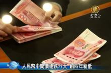 2015-11-13 12:44:21近來人民幣再度貶值,人民幣中間價,連跌八日,創三個星期以來新低,市場擔憂,如果人民幣持續貶值,資金外流將進一步加劇。請看我們來自香港的報導。