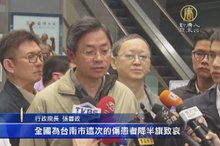 2016-02-10 19:16:40台南大地震災情慘重,還有多人失聯、下落不明,行政院長張善政今天再度南下探視0206台南地震傷患、災民,並宣布2月15日全國降半旗1天,向罹難同胞致哀。