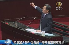 2016-02-26 20:10:33行政院長張善政今天在備詢時,針對新舊政府交接加入跨太平洋夥伴協定(TPP),張善政表示,已經提出待修改的法令,至於美國方面,希望台灣開放進口美國豬肉,做為條件。