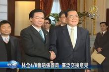 2016-04-01 20:20:03準行政院長林全辦公室今天表示,林全和行政院長張善政預定4月8日,下星期五,在行政院會晤,預定會晤1小時。雙方派各5人,包括,行政院副院長杜紫軍、政權交接小組共同召集人林錫耀,也都會出席。