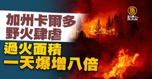 2021-08-19 21:37:48美國加州的大火目前仍在肆虐。根據加州林業和消防局的消息,14號晚間,在加州「奧莫牧場」燃起的「卡爾多」大火,正在以驚人的速度蔓延。17號到18號上午,受災面積從6千500英畝,暴增到5萬3千772英畝,不到24小時內,擴大了8倍。