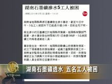 湖南省桂陽縣一座石墨礦,週日凌晨開始透水,5名在井下工作的礦工被困。截止週一中午,在被困30多小時後,仍未有5人消息,生死不明。