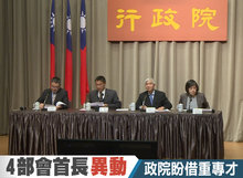 2017-02-03 18:42:59蔡英文政府執政八個多月進行首次內閣改組。行政院發言人徐國勇今晚18:30宣布改組名單,有四個部會。衛福部長將由前衛生署副署長陳時中接任、科技部長由教育部次長陳良基接任、農委會主委由宜蘭縣長林聰賢接任、勞動部則由政務委員林美珠接任。
