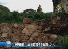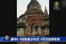 2016-08-25 07:05:49不只義大利,緬甸中部在台北時間昨天晚間,也發生 規模6.8的 強震,震央位在緬甸第二大城瓦城 西南方,深度84公里。地震威力連泰國和孟加拉都感受到明顯搖晃。古都 蒲甘 知名的浮屠佛塔,至少有68座佛塔被震毀,截至目前已知有4人死亡,其中包含兩名兒童。