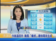 2017-08-17 12:54:30歡迎回來。受到太平洋高壓勢力減弱的影響,今天開始為期一週, 北台灣高溫將降到36度左右,至於中南部及東部地區,則是在33到35度。水氣也會增多,午後在各地山區、大台北地區及中南部,有機會發生雷陣雨。另外需要注意的是,一週後,在菲律賓海域將形成適合颱風發展的環境,目前各國模式都已經模擬出颱風生成並且將會影響台灣的可能性,因此在8月下旬一路到9月間,台灣不排除將進入颱風活躍期。