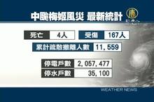 2016-09-28 20:08:38颱風梅姬肆虐,統計這次災情,共造成4死625傷,1萬5千多人被撤離,農損超過3.4億,停電人數來到380多萬戶,全台有536處淹水,其中,在台南37區中有25區通報淹水,許多街道都變成了河道。帶您直擊。