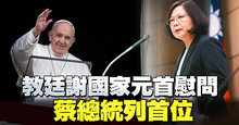 2021-07-09 12:57:43鏡頭轉到台灣友邦梵諦岡,84歲的天主教教宗方濟各 4日接受大腸炎手術,梵蒂岡官網 8日列名感謝各國元首的慰問訊息,其中總統蔡英文被列為首位,表示蔡總統在5日第一時間就致函關心教宗。方濟各7日也在推文中表示,「感謝大家與我同在,並為我禱告。」