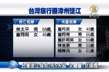 2014-05-23 21:02:46新聞一開始來看到,再傳重大事故傷亡,這是台灣到大陸福建漳州的旅行團。一輛載有26人的遊覽車今天中午行經漳州市華安縣新圩鎮坑口路段,掉進九龍江,車上除了中國司機和導遊外,另有24名台灣旅客,平均年齡大約是五六十歲的阿公阿嬤團。其中19人獲救,有7名台灣旅客落水失蹤,不過據了解,廈門方面傳回的消息,七人已經證實全部罹難。