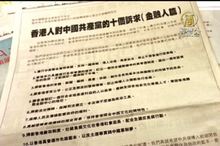 2014-04-24 21:36:05禮拜三,香港70多位金融界專業人士,發表公開信,要求中共停止干預香港行政事務。這封信同時刊登在多家平面媒體,呼籲中共勿干政,讓港人高度治港。而這樣集體登廣告,抗議中共的行動,已經不是第一次。