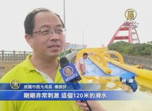 2016-08-27 21:16:25桃園竹圍漁港的知名地標彩虹橋,在經過整修後,周六(8/27)舉辦啟用典禮,適逢暑假尾聲,市政府特別在橋邊搭建出一條120米長的滑水道,讓民眾來享受滑水的刺激與清涼。