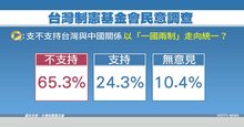 2019-01-18 20:17:50再來看到,由總統府資政辜寬敏,成立的「台灣制憲基金會」今天公佈民調,有超過6成5的台灣民眾,不支持以「一國兩制」走向統一,而昨天陸委會公布的民調更高,高達75%的台灣民眾,不贊成「一國兩制」。