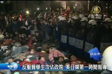 2014-03-24 07:07:47反黑箱服貿運動,昨天晚上發生了激進派群眾攻佔行政院的事件,演變成嚴重的衝突。國際間包括美國和日本媒體,都在第一時間,進行了報導。