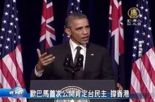 2014-11-17 12:49:46美國總統歐巴馬出席二十國集團(G20)高峰會,15日在昆士蘭大學發表演說,提到香港的真普選抗爭,他說示威者「是為他們的普世權利挺身發聲」,並強調過去美國講民主常遭到「這是西方價值」的回應,但他不同意,因為日本、台灣和南韓都已經建立生氣蓬勃的民主。這是歐巴馬首次公開肯定台灣民主。今天晚間,我們還會有更詳盡的報導。