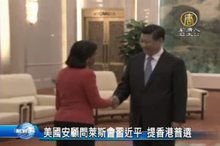 2014-09-10 21:23:22國際焦點來看到,美國國家安全顧問萊斯訪問中國,今天,外媒引述表示,萊斯與習近平會談的45分鐘期間,對香港普選提出關切。美國國家安全顧問萊斯,三天的中國訪問,對日前中共戰機接近美方軍機的事件表達立場,而在9日與習近平的會面中,更談及香港普選問題,美國高級官員接受採訪表示,香港直接普選、公民一人一票是非常重要而基本的,也是美國所追求的目標。