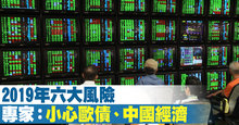 2018-12-05 20:17:34全球股市震盪劇烈,讓市場格外關心,2019年全球經濟展望,有財經專家分析,明年共有六大風險,除了貿易戰之外,更要小心歐債問題、中國經濟成長下滑,並且專家預測,美國對中共強硬態度不會轉變,三個月後,貿易戰還將重新啟動。