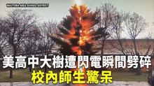 2021-04-23 11:46:27美國威斯康辛州的一所高中日前上演了雷神發威的戲碼。只見一道從天而降的閃電精準地擊中一棵樹木,而且如摧枯拉朽般將它擊碎,讓校內的師生們見證了大自然的神奇力量。