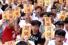 2014-09-26 21:09:43香港大專生罷課星期五步入第五天,中學生加入罷課行列,在政府總部前集會,抗議人大常委會的政改框架,要求真普選,有1200人參與,超出預期。