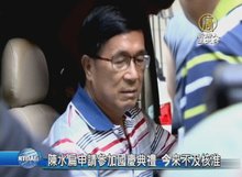 2016-10-10 12:50:43前總統陳水扁申請出席雙十國慶,遭台中監獄否決。法務部次長稍早出席國慶典禮時,被問到相關問題時,他說考量國慶臨時搭建舞台,還有開放空間等因素,恐怕不利陳水扁健康,因此決定不准。