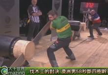 2015-05-24 15:43:49最近在義大利佛羅倫薩舉行的伐木工人世錦賽上,澳洲壯漢布拉德•德羅薩(Brad Delosa)僅用58秒就斷開4根樹幹圓木,創造了新的世界紀錄。
