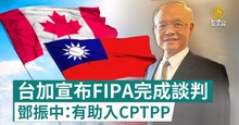 2023-10-25 07:02:23早安新唐人先帶您關心,台灣、加拿大昨天(24日)共同宣布,FIPA,也就是「投資促進及保障協議」相關談判完成。行政院政務委員鄧振中表示,70多項條文不到一年就達成協議,是國際相當傑出案例,有助台灣企業全球投資布局。鄧振中還說,加拿大明年是CPTPP主席,協議一旦簽署,可以證明台灣是接受高標準的國家,也有助於台灣加入CPTPP。另外,加拿大官網也發布聲明,強調加拿大正與台灣合作,確保協議盡快簽署並生效,聲明還寫到,台灣是一個重要的貿易和投資夥伴,尤其是,加拿大要深化與印太地區的經濟夥伴關係,這也是印太戰略的