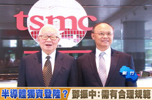 2015-08-28 20:35:46經濟部長鄧振中今天(28日)上午拜訪半導體大廠台積電,董事長張忠謀親自接待。鄧振中受訪時表示,此行是特地來感謝台積電對再生能源發展的貢獻,雙方並沒有談到12吋廠登陸的事情,不過,鄧振中說,半導體登陸,要有合理規範。