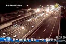 2015-10-09 20:01:28今天是雙十連假的第一天,新聞開始,為您彙整國道和平面道路的塞車和交管情況。根據高公局監測,上午西部國道多路段壅塞,包括,國1五楊高架南下中壢轉接道至 楊梅端、國1南下湖口至新竹系統。另外,要提醒您,迎接明天雙十大典,今天晚上10點,總統府周邊道路將進行管制,提醒駕駛朋友改道行駛,而稍早傳來,有人寄信到交通部長信箱,揚言明天凌晨在捷運發動恐怖攻擊,對此,捷運警察隊已經加強巡守,初步調查發信者IP位在國外。