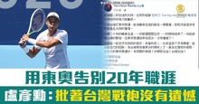 2021-07-26 07:16:00台灣網球好手盧彥勳,東京奧運首戰不敵德國選手,以1比6、3比6吞敗止步,網球生涯也畫上句點。盧彥勳5次作為奧運代表,結束最後一場比賽,他在臉書寫下心情,「能披著台灣的戰袍,在東京奧運結束後退休,沒有遺憾了。」總統蔡英文也發長文感謝,寫到「彥勳用手中的球拍,在奧運殿堂上,一次又一次讓世界看見台灣」,同時也向盧彥勳喊話,「你提過想培育後進的心願,以及其他該做的事,我們一起努力。」