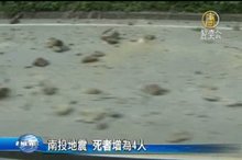 2013-06-03 21:03:14繼續來關心的是,昨天的南投地震,死亡人數增為四人。消防署今天說,35歲的楊姓男子2日在南投縣竹山鎮附近溪谷釣魚,因地震遭土石掩埋,目前已經找到屍體,這起地震,造成全台4人死亡、3人重傷、以及17人輕傷。