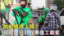 2020-06-26 10:49:36印尼逐步解封之後,雅加達獨特的摩托計程車,又重新穿梭在大街小巷載客。司機騎士主動防疫,背著特製的透明塑膠盾牌,在司機與乘客之間做出區隔,讓顧客感受到保護,有效挽回信心。