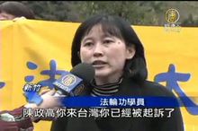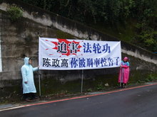 2011-02-19 21:15:13已經在台灣被刑事控告,殘害人群罪的遼寧省省長陳政高,18日晚間深夜抵達新竹喜來登,飯店外,滿滿都是法輪功學員的抗議旗幟,而星期六,在新竹風景區,陳政高也再度遇上抗議人群,讓在風景區的其他遊客,了解到了中共官員在中國迫害人權的殘酷惡行。