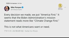 2021-04-20 07:19:54前美國國務卿蓬佩奧,台北時間昨夜(19日)發布推文,他寫到:我們所做的每個決定都把「美國放在第一位」。而拜登政府的聲明讀起來,更像是把「氣候變遷放在第一位。」這不是美國人想要或需要的。