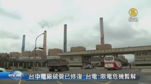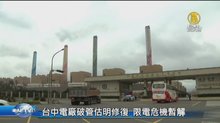 2017-08-07 07:05:23台中火力電廠一號機上周六驚傳破管意外,電力系統 頓失55萬 瓩供電,台電方面表示,經過檢視 鍋爐破管的情況並不嚴重,昨晚就已經修復完畢,並恢復併聯發電,可望趕在今天下午用電尖峰前,滿載供電。台電研判目前不會發生必須停限電的情形。不過,未來這一周氣溫持續高溫,台電仍呼籲社會各界,節約用電。