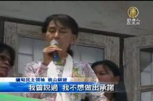 2012-03-30 21:40:47緬甸民運領袖翁山蘇姬,上週在選戰途中病倒,中斷拜票行程,因而引發外界重病的傳言,今天(30日)上午,翁山蘇姬公開現身舉行記者會,一方面破除傳言,另一方面,也宣示儘管4月1日舉行的國會補選,不是完全民主的選舉,但她仍然有決心進入國會。