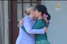 2011-12-02 21:39:56正在緬甸進行歷史性訪問的美國國務卿希拉蕊柯林頓,週四(十二月一日)結束在仰光行程後,當晚立即與緬甸民主派領袖翁山蘇姬共進晚餐,週五希拉蕊再度光臨翁山蘇姬在仰光的湖濱住所,二人就民主政治改革問題進行了深入交談。