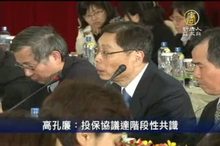 2010-12-20 20:01:30新聞頭條,帶您鎖定,第六次江陳會預備性磋商今天(20日)下午3點在台北圓山飯店舉行,歷時1個小時結束。海基會副董事長高孔廉會後表示,兩會確認在兩岸醫藥衛生合作協議達成5項共識,將如期提交明天江陳會談簽署,至於投資保障協議,由於內容廣泛、討論時間不夠,並沒有達成協議的文本共識,但是兩會仍將就目前已達成的階段性共識做說明。高孔廉指出,協議的落實比簽署更重要。