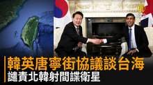 2023-11-23 19:44:32歡迎回來。南韓總統尹錫悅訪問英國,週三(22日)與英國首相蘇納克簽署「唐寧街協議」,雙方建立「全球戰略夥伴關係」,協議中提到台灣海峽和平穩定,對國際社會的安全與繁榮不可或缺;同時在會談中,雙方一致譴責北韓利用彈道飛彈技術發射軍事偵察衛星,是對國際社會發起的挑釁。