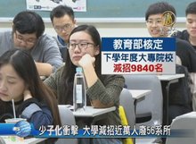 2016-12-27 20:21:57再來看到,受到少子化衝擊,教育部最新核定,明年度,大專院校將減少招生9840個名額,其中有143個系所將暫停招生,更有56個系所將消失,就連龍頭台灣大學也首度出現減招17人。